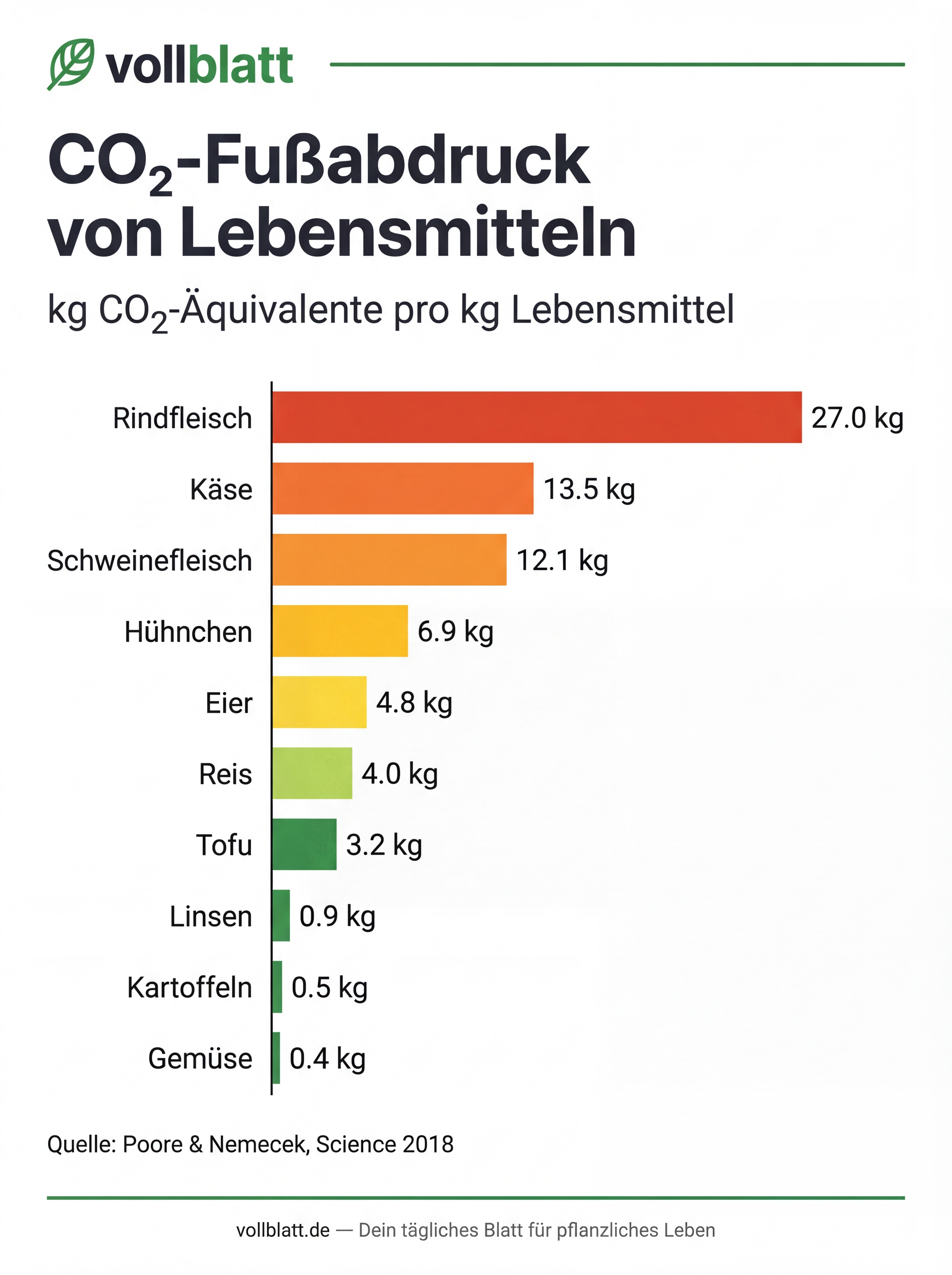 Vergleich der Treibhausgasemissionen: Wie viel CO₂ verursachen tierische vs. pflanzliche Lebensmittel pro Kilogramm? Basierend auf Poore & Nemecek (Science, 2018).