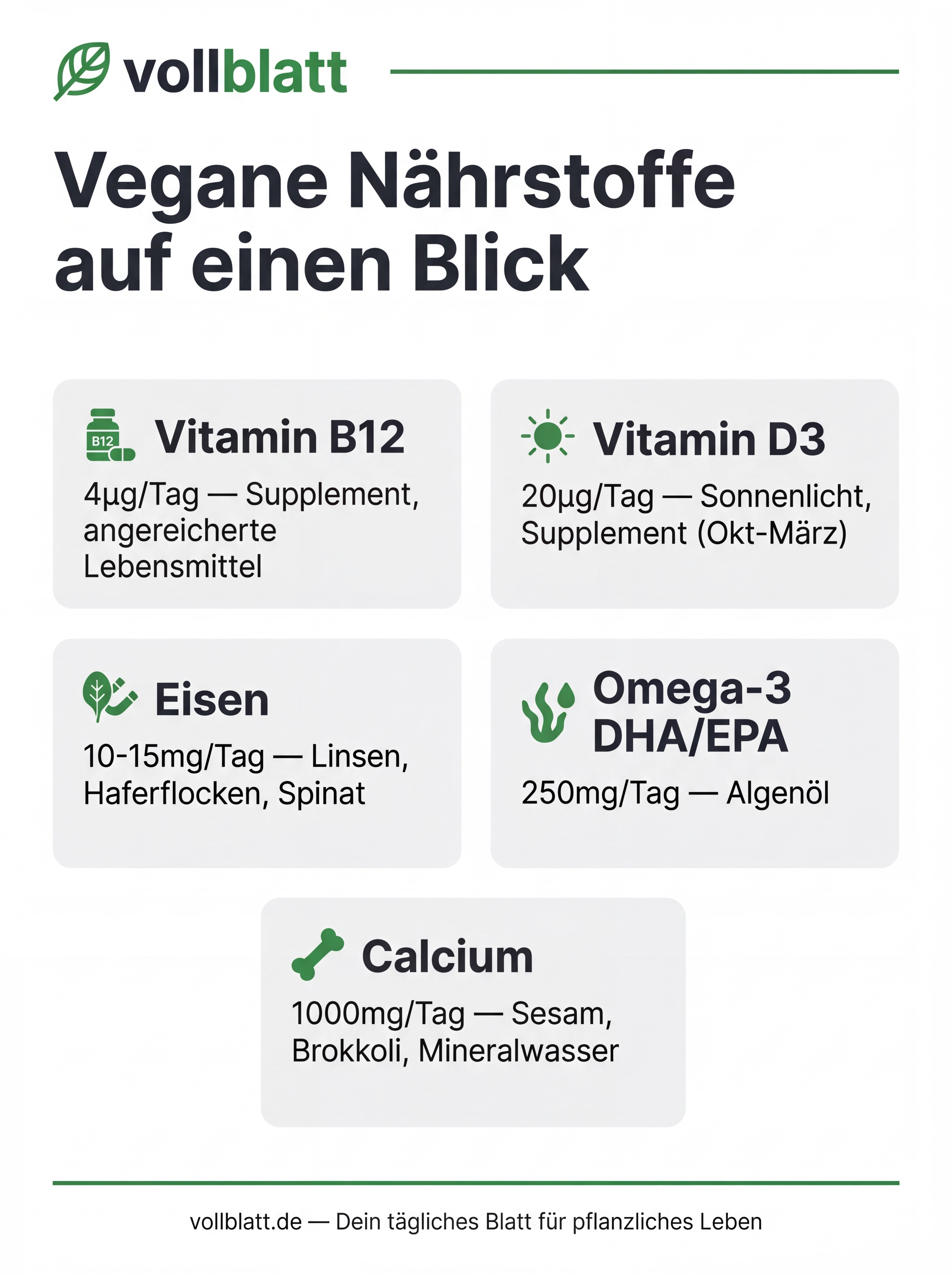 Übersicht der wichtigsten Nährstoffe bei veganer Ernährung: B12, Vitamin D3, Eisen, Omega-3 und Calcium — mit Tagesbedarf, Quellen und Tipps.