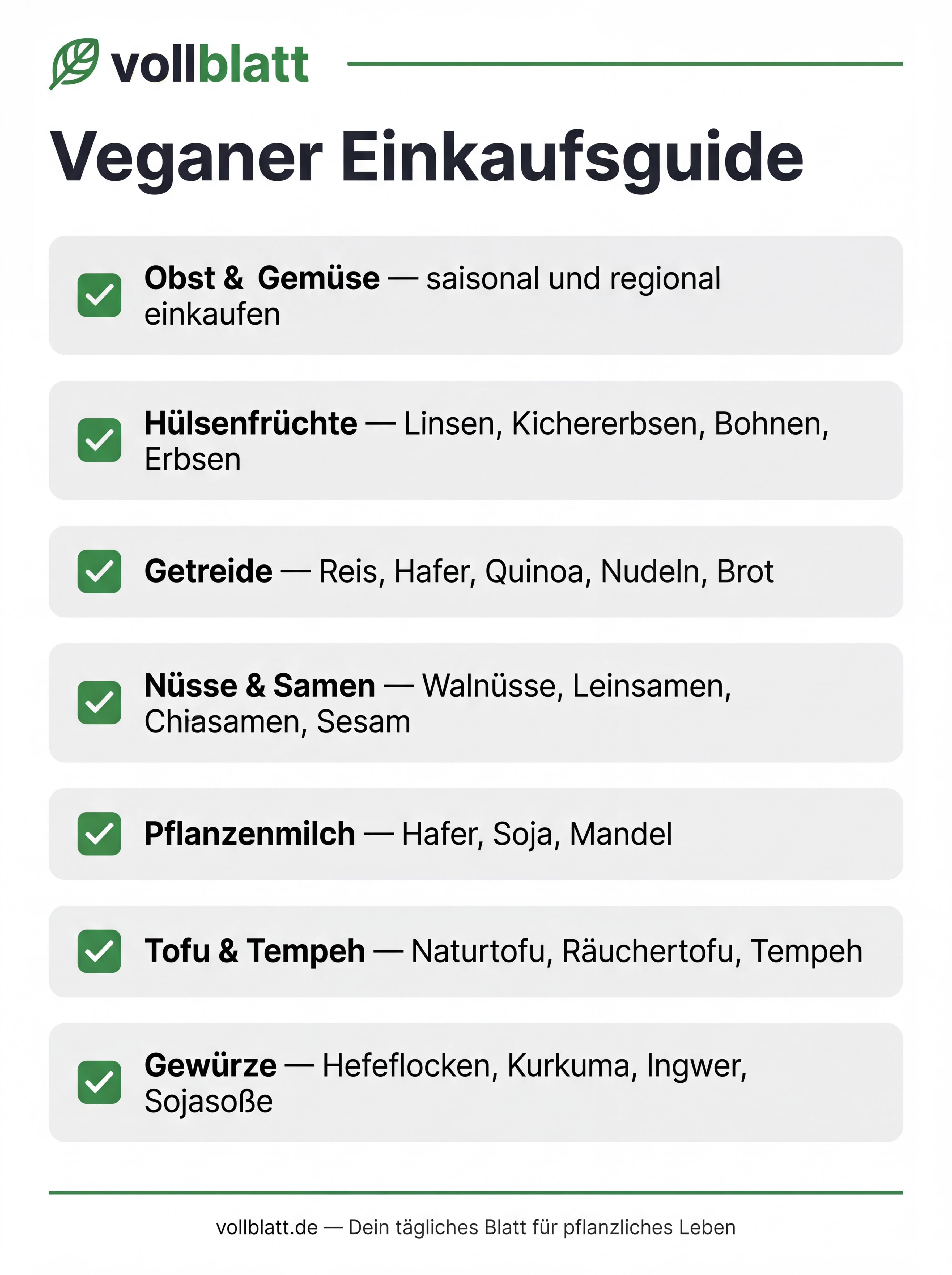 Einkaufs-Checkliste für vegane Einsteiger: Obst & Gemüse, Hülsenfrüchte, Getreide, Nüsse, Pflanzenmilch, Tofu & Tempeh — nach Supermarkt-Abteilungen sortiert.